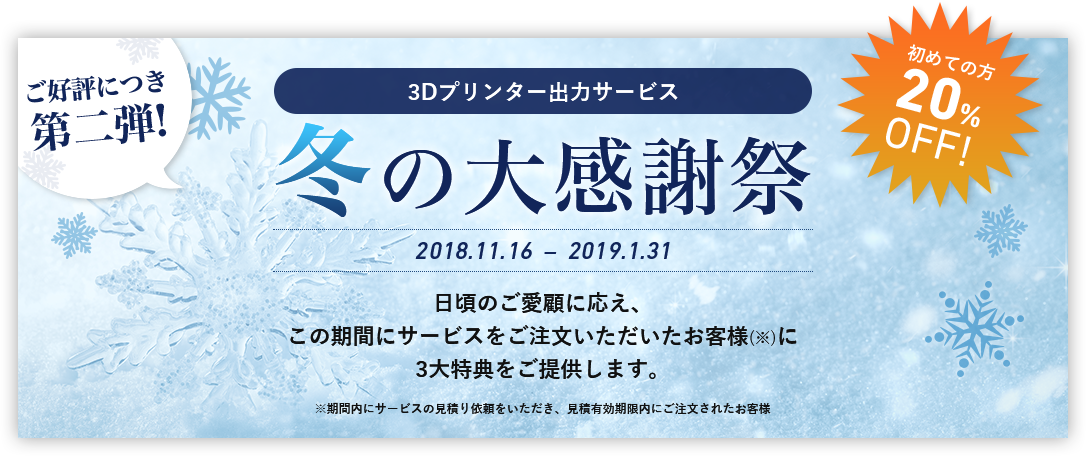 | 適用条件 | キャンペーン期間中に、キャンペーン専用見積り依頼フォームから、「リコー3Dプリンター出力サービス」(当サービス)の見積り依頼をいただき、見積有効期限内にご注文されたお客様が対象となります。