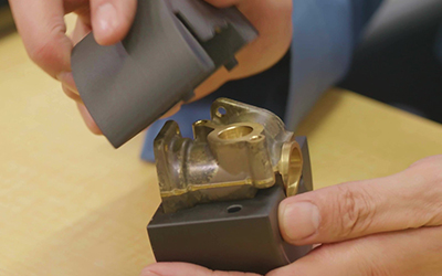 間接部門としては、生産性の効率化へ貢献することを目指しました。まず、Mark Twoの強度などの特性から、治具の材料として使用できる可能性を検討し、試作をつくり評価を行ってきました。しかし、それだけでは費用対効果が満足できなかったため、もともと金属製だったNC旋盤治具を3Dプリンターで製作することにチャレンジ。生産効率が改善できると判断したため導入。NC旋盤で使われる治具、マシニングセンター、漏れ検査などさまざまなところで活用を行っております。