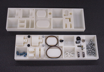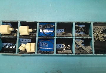 部品形状に合わせた配膳トレイ作成により、トレイ上を目視で部品のチェックができミスを防止。