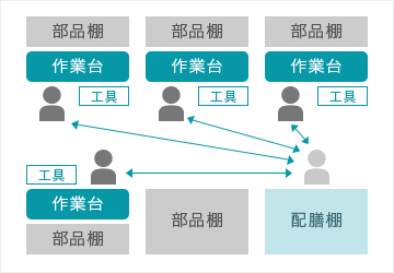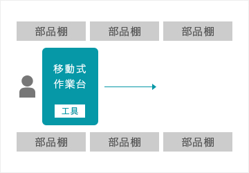 ミスの低減だけでなく、生産性の改善も大きなテーマとなっていました。大型機は作業者1人当り数百点もの部品を組立てる必要があり、いかに素早く部品を集めて効率的に組み上げるかがカギとなります。しかし、従来の作業台を中心とした工程設計がさらなる改善を実現するための足かせになってしました。