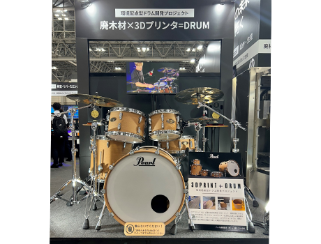 「3Dプリンターでドラムをつくる!」なんて途方もないプロジェクトが千葉にあるドラムの世界的TOPメーカー Pearl楽器様と九州・福岡の木材加工会社 井上企画様とで実現し、両社のご厚意によりリコージャパンブースにて展示・披露されました。薄茶の胴の部分が3Dプリンターで造形されていますが、実はこの材料ドラムの王道と言われるメイプル材の端材を粉砕し、ペレットに再成形し3Dプリンターで造形されたアップサイクルドラムです。