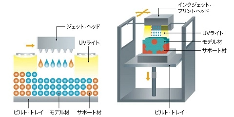 インクジェットヘッドから噴射した樹脂を、紫外線で固めて積層する方式です。高精細で滑らかな表面のモデルを造形しやすく、精度が求められる造形物の出力に力を発揮します。機種によっては複数の素材を選択し、混ぜて使うことも可能。紫外線で硬化する樹脂を使う特性上、造形物は太陽光での劣化が起こりやすくなります。