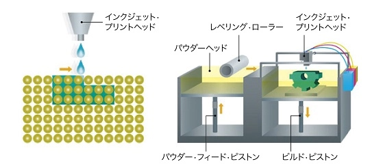 インクジェットヘッドから光硬化性樹脂を結合材として噴射し、粉末を一層ずつ固めていきます。光硬化性樹脂の色を変えることで、粉末を容易に着色できるため、 デザイン関連の確認やフィギアの製作などに向いています。また、造形速度が速く、未使用の造形材料は次回の造形に再利用して無駄を排除できるため、時間と資源を節約でき、優れたコストパフォーマンスを発揮します。