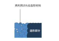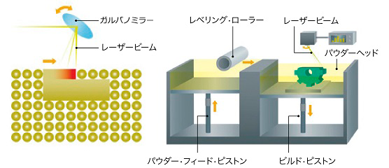 粉末状の素材にレーザーを照射して焼結させる方式です。 この方式では、高精細かつ耐久性のある造形物を製作でき、金属金属素材も使用可能なので、最終製品や鋳型の製造にも用いることが可能です。 また、縦方向に効率的に造形できるため、高速かつ低コストで造形物を製造することができます。大型サイズの造形に適しています。