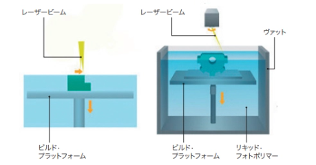 液体状の を、紫外線レーザーで一層ずつ硬化させて積層していく方式です。高精細かつ表面の滑らかな造形物を作成することが可能です。SLS同様、大きなサイズの造形が得意です。