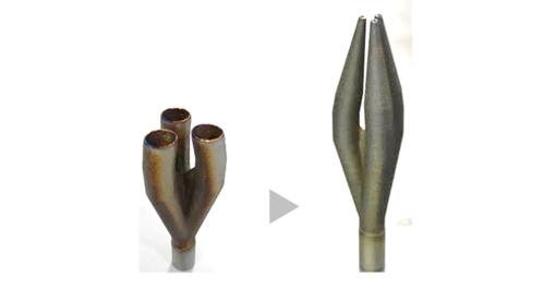 既存品はフラットなものである必要はなく、例えば、使用していたノズル部品の先端が痛んだら、痛んだ部分を削除し、残した部分の上に付加積層造形して修復することも可能になります。