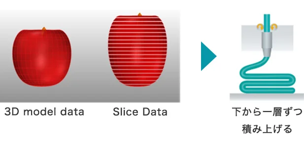 3Dプリンター(正式名称:Additive manufacturing)とは、3Dモデルデータを基に、材料を結合して造形物を実体化する加工法です。多くの場合は、造形層を積み重ねる形態をとっており、図のように、3Dモデルデータをスライスデータと呼ばれる一定間隔の断層データに加工し、そのデータをもとに、一層ずつ材料を"くっつける"ことを繰り返すことで、造形物ができあがります。
