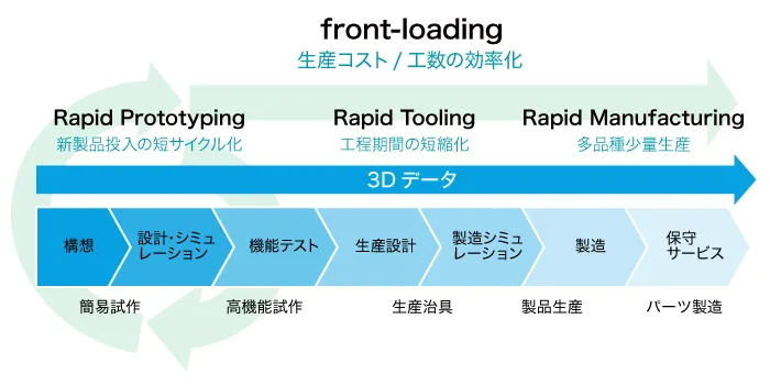 続いて、3Dプリンターの主な導入効果を解説します。上記で言うとフロントローディングやラピッドプロトタイピングにおける効果と考えるとわかりやすいですが、ラピッドツーリングやラピッドマニュファクチャリングにおいても同様の効果が期待できます。