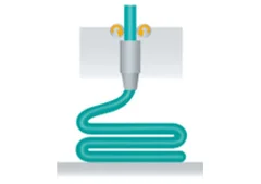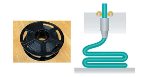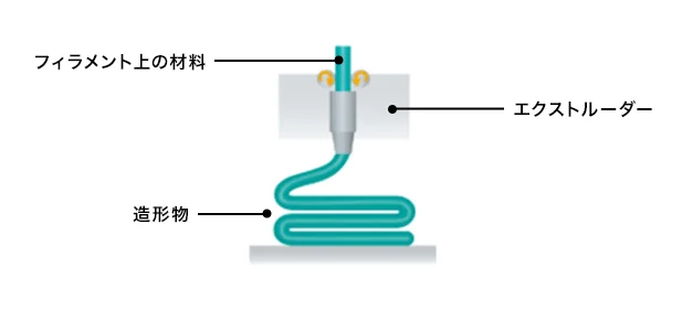 原材料をエクストルーダーから押し出し、X-Y走査で任意の形状に堆積していくプロセスです。一般的には熱可塑性樹脂(一般的にはフィラメント上の樹脂材料)をエクストルーダー内で加熱溶融させ、堆積後の冷却により凝固させることで造形します。