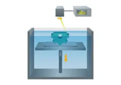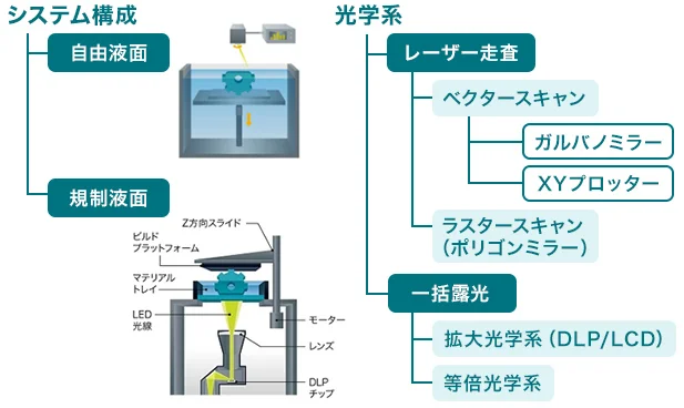 システム構成において、自由液面は、造形物が造形中に浮力を得ているため、重力影響が少なく大型造形に向いていますが、常に液槽内を樹脂材料で満たす必要があります。一方、規制液面は液槽内の樹脂は造形時に使用する量だけでよく、交換も容易にできますが、造形物は液面上に引き上げられるため重力影響を受けます。