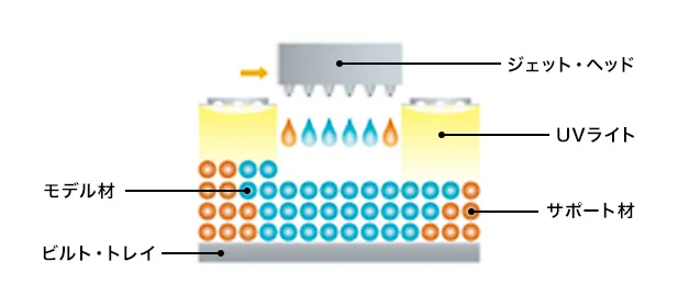 インクジェット技術を用いた造形プロセスです。造形物を構成する物質を液化した状態でインクジェットヘッドから吐出し、その後のプロセスで硬化させます。UV硬化樹脂をインクとしてヘッドから吐出し、UV照射によって硬化させ、造形層を重ね造形物を得る手法が一般的です。一部ではワックスを溶融させてインクとして使用するものもあります。