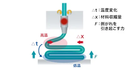 しかし、冷えた樹脂に新しい層を重ねて都度固めていくことから、下に凸の応力が発生します。これが反りの原因となります。対策は造形物の温度を高い状態に保つこと(チャンバー搭載)と、材料自体の収縮率を下げることなどが多くのMEX方式の装置・材料で採用されています。