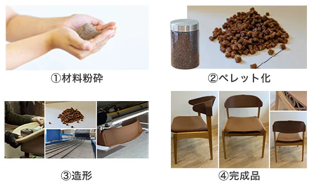 廃材を再利用し製品へとアップサイクルできる点もこのペレット式の特長です。実際に回収した容器等からペレットを生成し、材料として使用した実例もあり、プラスチックの資源循環の実現に向けても大変注目されております。また、廃棄される木材(端材やチップ)を活用したペレット材料の開発・造形などを通し、事業開発に取り組んでいる事例(以下の画像参照)もあります。