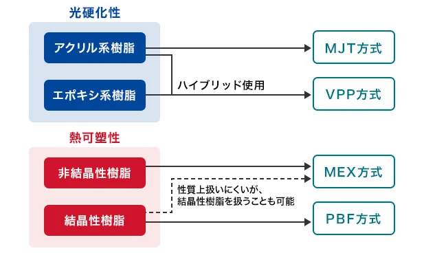 以下に、3Dプリンター用の樹脂材料の分類を図示します。各方式の原理と合わせて理解することで、材料視点での機種選定がスムーズになりますので参考にされてください。