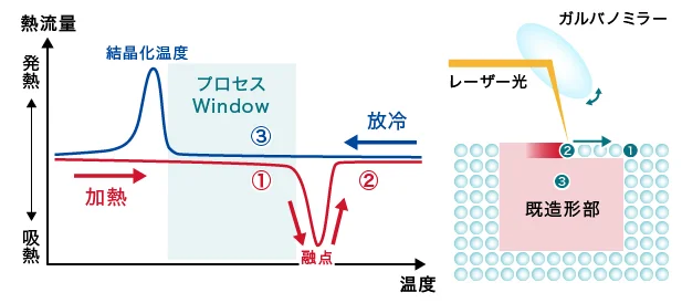 (※)加熱により溶融すると溶融のタイミングで物質内に熱が取り込まれ、次に冷却していくと凝固のタイミングで熱が放出されます。1部の樹脂では、凝固と溶融の温度にズレが存在します。PBF方式はその温度帯(プロセスウィンドウ)に造形庫内温度を保つことで、凝固せず溶融状態を保ったまま積層を重ね、サポートレスや反り抑制の役割を果たしています。そのため材料毎に緻密な温度制御が必要となります。なお、造形原理に関する詳細は出典元の著書で詳しく解説しております。