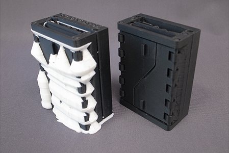 FDM方式やマテリアルジェット方式などの殆どの3Dプリンターでは、3Dプリント(造形)の完了直後には、目的物の形状によってはサポート材*1と呼ばれる目的物の形状を保持するための副材が、目的物のまわりや内部に付着したままの状態となっています。このため、3Dプリント後に目的物に付着したサポート材を除去する作業が必要となります。