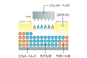 バインダージェッティングカラーでの造形、速度の早い造形が可能で、サポート素材の除去が不要といった特徴がある方式です。