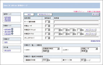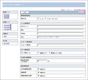 システムに関するエラーが発生した場合の通知方法や、印刷データの保存形式はRAW/EMF/TXT/JPG(管理サーバー上でRAWから変換)などが設定可能です。なお操作画面は、Webブラウザでさまざまな設定が容易に行なえるように設計されています。