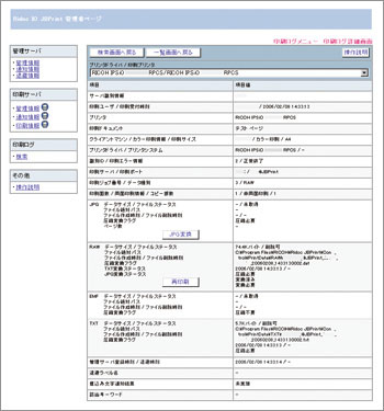 | 詳細表示項目 | サーバ識別情報、印刷ユーザ/印刷受付時刻、プリンタ、印刷ドキュメント、クライアントマシン/カラー印刷情報/印刷サイズ、プリンタ/プリンタシステム、識別ID/印刷エラー情報、印刷サーバ/印刷ポート、印刷ジョブ番号/データ種別、印刷面数/両面印刷情報/コピー部数、JPG、RAW、EMF、TXT、管理サーバ登録時刻/退避時刻、退避ラベル名、埋込み文字通知結果、該当キーワード |