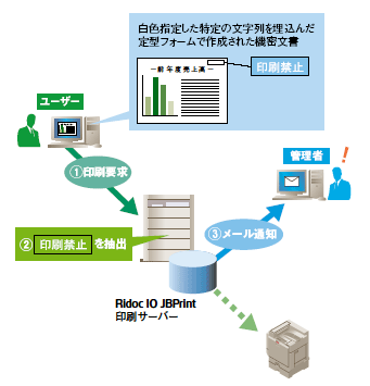 ユーザーは従来通りの印刷操作を行なうだけで、「Ridoc IO JBPrint」の印刷サーバーが印刷ログ・印刷データを収集し、「Ridoc IO JBPrint」の管理サーバーへ自動転送します。印刷データの保存形式はRAW/EMF/TXT/JPG(管理サーバー上でRAWから変換)をサポート。また、システム運用形態に応じて、印刷ログのみの転送も設定できます。【機密文書の印刷要求を検知し、管理者にメール通知】