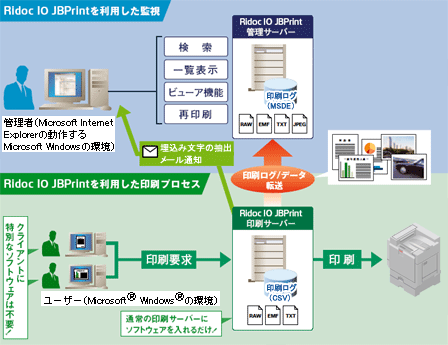 「Ridoc IO JBPrint」は、ユーザーが印刷指示を行なった際に、ファイル名やユーザー名などの印刷ログだけではなく、具体的なイメージが確認できる印刷データそのものを、印刷サーバーと管理サーバーの連携により自動的にバックアップ。