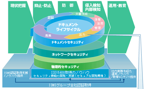 人的・組織的セキュリティはもとより、ネットワークセキュリティ、デジタル情報~紙に印刷された情報まで含めたドキュメントセキュリティ、セキュリティ体策の運用・サービスの提案まで、情報資産に関わるさまざまな側面から、セキュリティソリューションをご提供いたします。 |