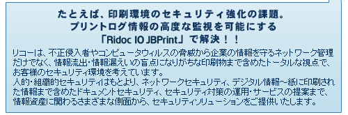 リコーは、不正侵入者やコンピュータウィルスの脅威から企業の情報を守るネットワーク管理だけでなく、情報流出・情報漏えいの盲点になりがちな印刷物まで含めたトータルな視点で、お客様のセキュリティ環境を考えています。