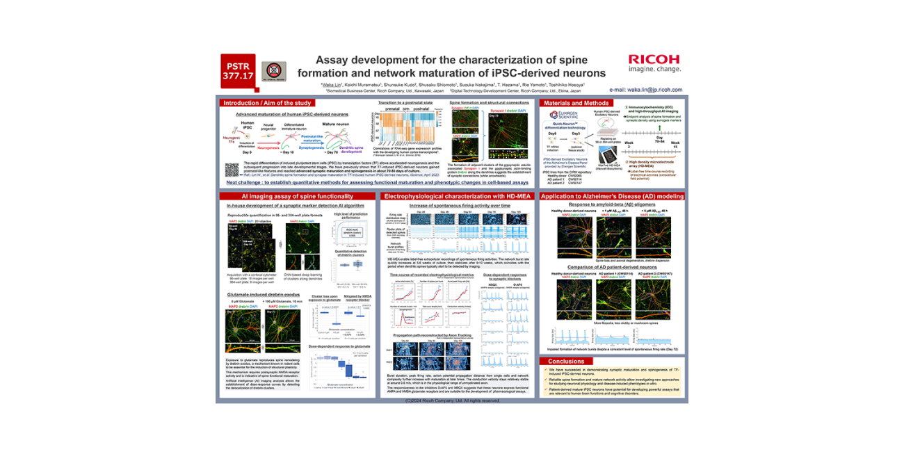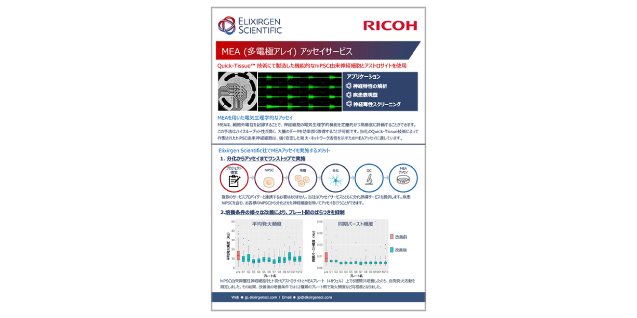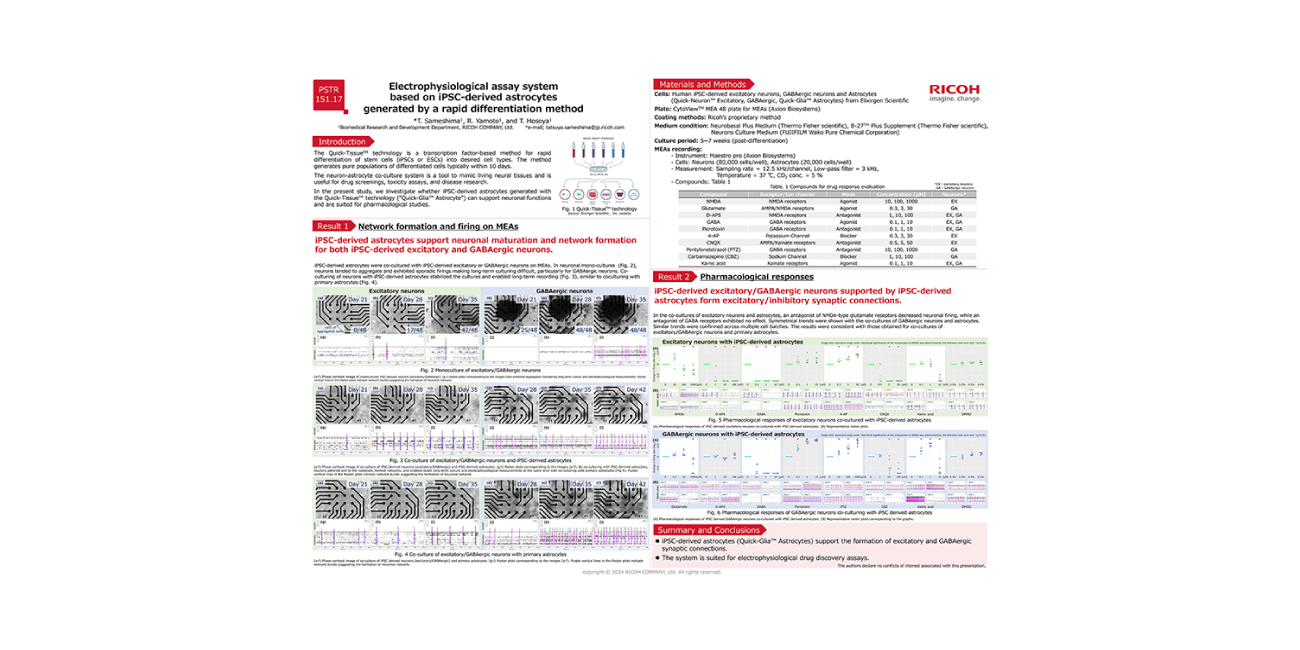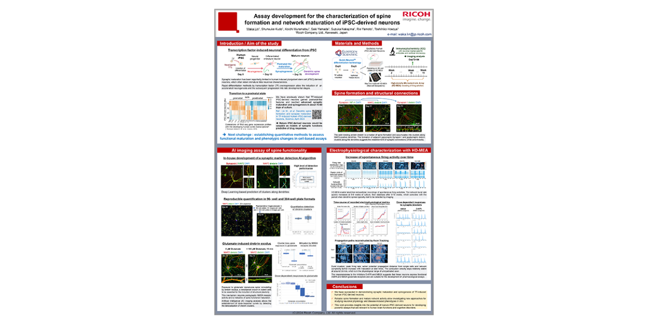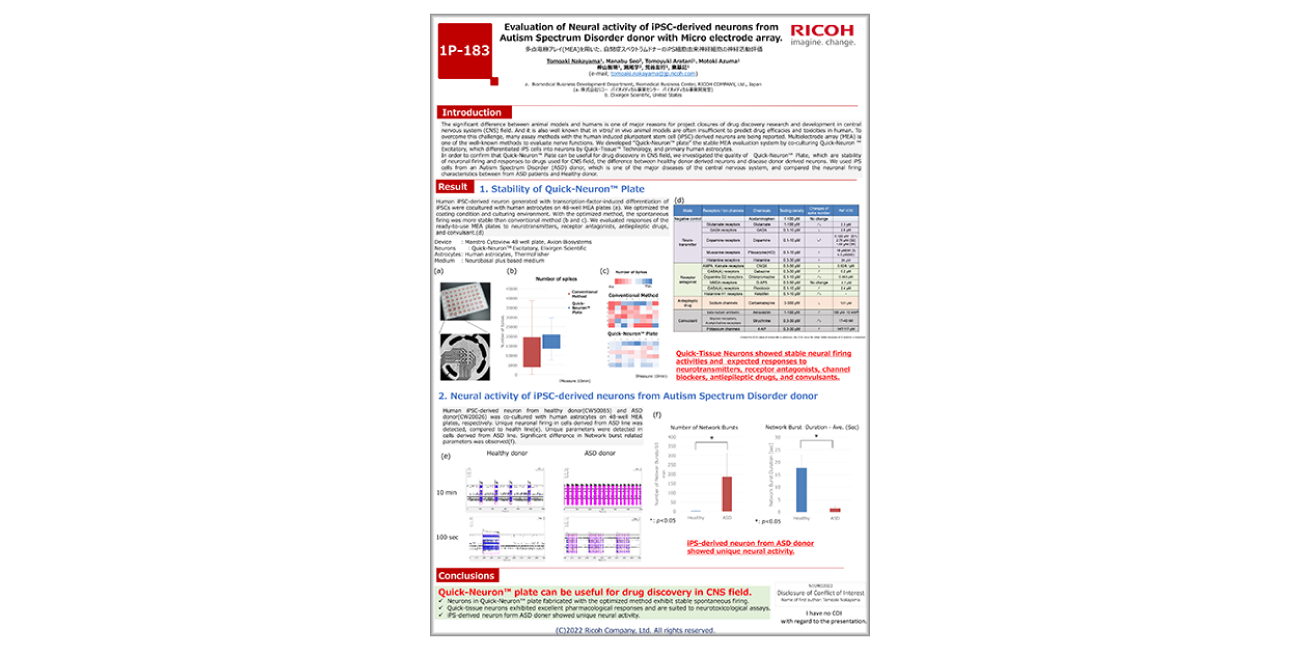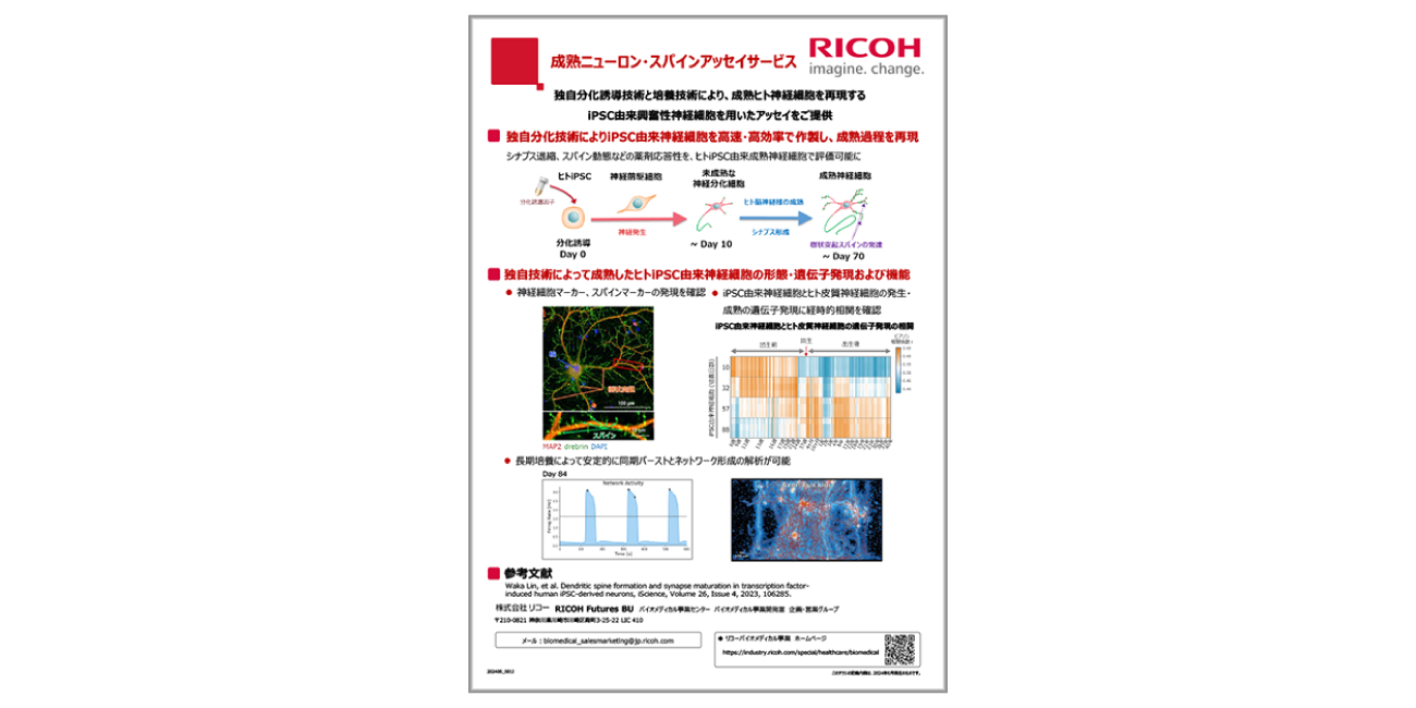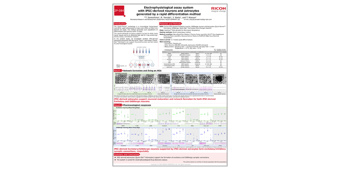 ヒトiPS細胞由来の神経細胞を用いたMEAアッセイは神経科学の分野で有効な解析手法の一つです。リコーは創薬研究へのさらなる貢献を目指して開発を進めてまいります。