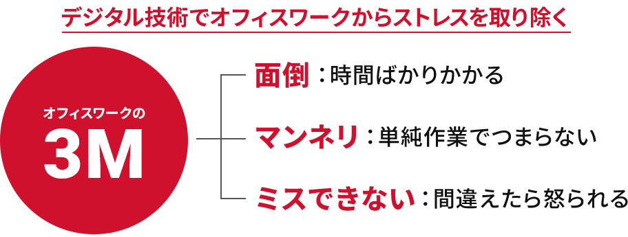 これらを現場の3Kに対比する「オフィスワークの3M」と名付けて、無くしていこうと考えました。
