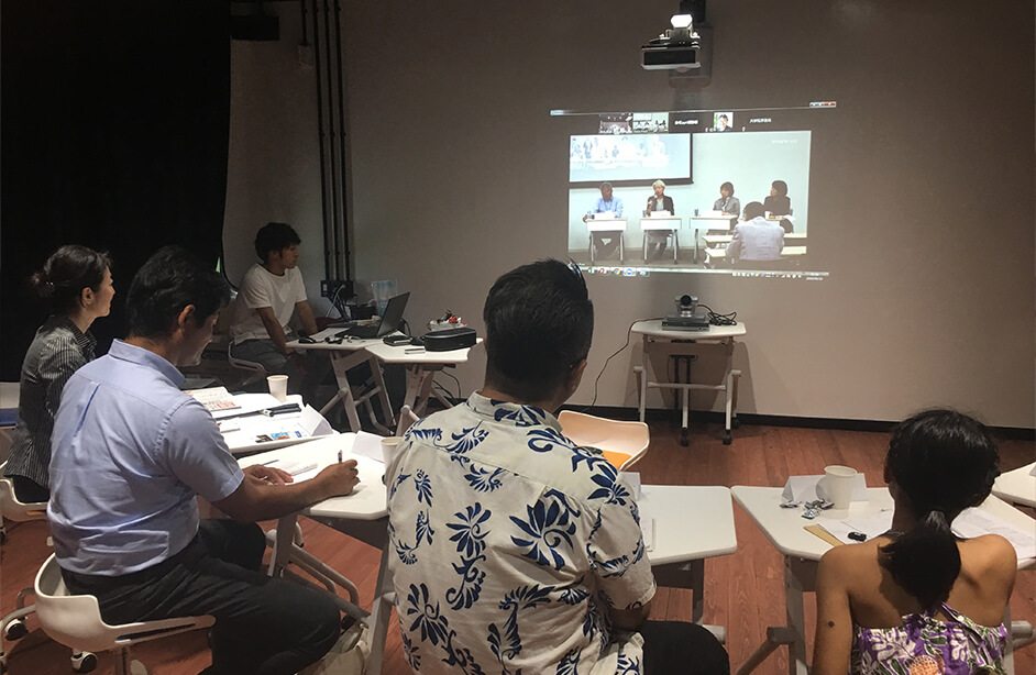 同学会の主会場である神奈川県横浜市のニュースパークと「エラブココ」をリモート接続し、参加を実現することができました。