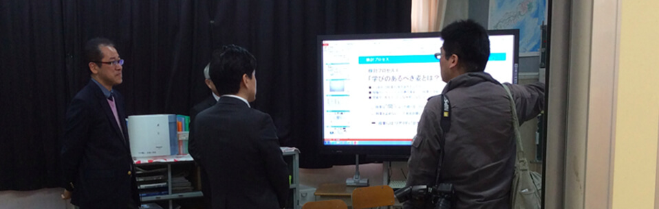 いよいよ迎えた新システムのお披露目。この日は、田滝小学校と徳田小学校をつないだ公開授業が実施され、NHKや民放テレビ局、ほか多数の新聞社が取材に訪れました。また、多くの保護者や地元住民の方々も見学に訪れました。