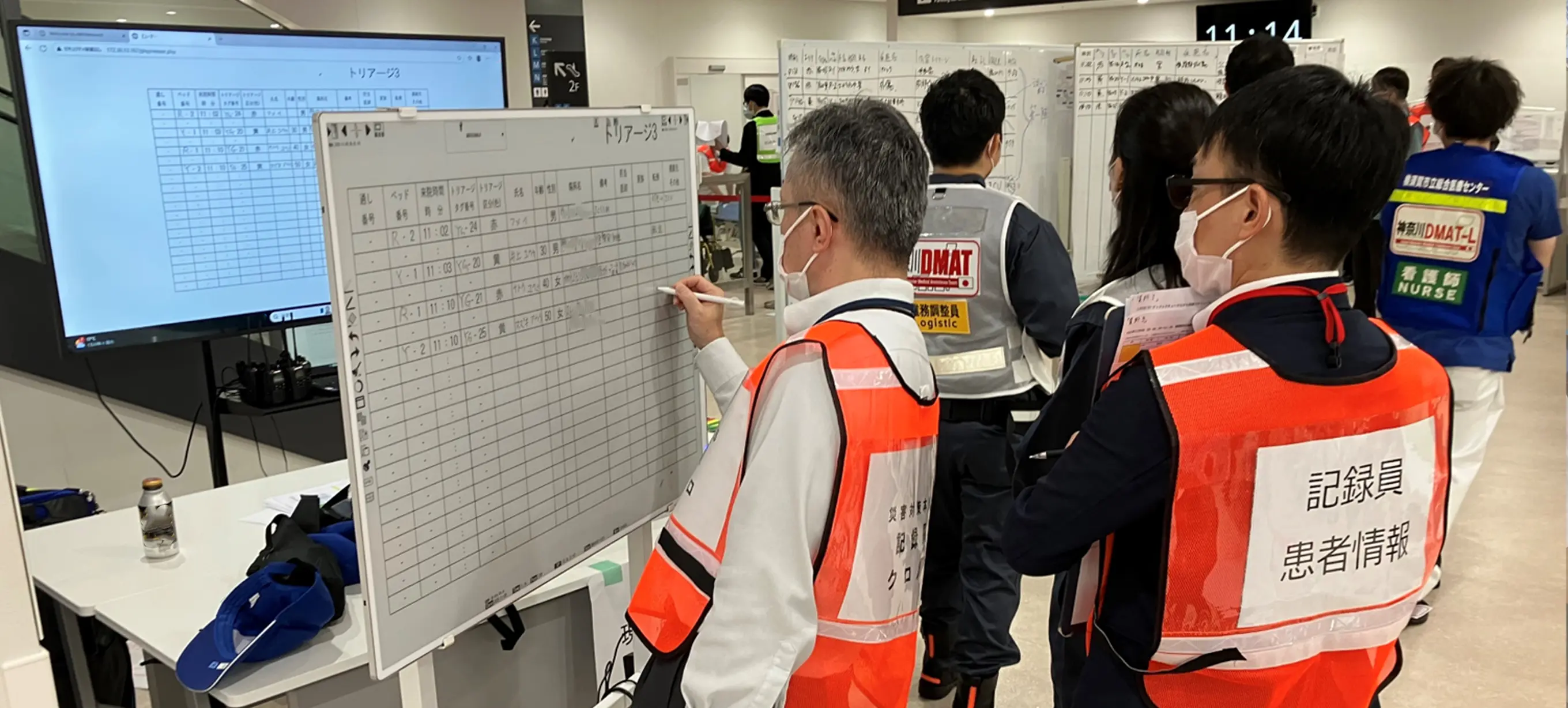 また、3つのエリアで集められた「傷病者の性別」「名前」「年齢」「怪我の状況やどのような処置を行なったか」などの情報は、1階の現地調整所に設置されたeWBに記入。記入された内容は、3階の災害対策本部のeWBとリアルタイムで共有され、病院外への転送が必要かどうかなどの状況判断にもご活用いただきました。