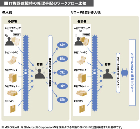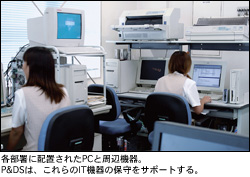 検討していただいた結果、●リコーのP&DSなら社内のデスクトップPC、ノートPC、各種プリンター、スキャナー、MO、モデムに至るまで、マルチベンダーで保守対応が可能●P&DSコールセンター1ヵ所に連絡するだけで煩雑な修理手配が完了●“代替機”が利用できる、といった点を評価いただきました。そして、それらが低コストで実現できることがポイントとなり、ご採用いただきました。