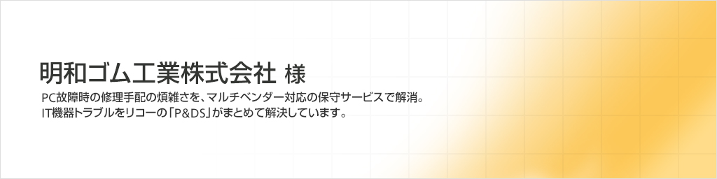 近年、社内の情報化を積極的に推進し続けている「明和ゴム工業株式会社様」。そのなかで、IT機器のトラブル処理にかかわる煩雑な業務を改善するためにリコーの「P&DS(パソコン&デバイス・サービス)」を導入。 新たな企業活動を展開するための安心材料のひとつとして、リコーの新しい保守サービスが貢献しています。