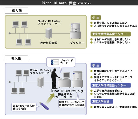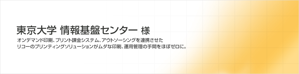 国立大学法人化をむかえた東京大学様において、その大規模な情報システムを支える印刷環境のさらなるコスト削減、効率アップを目指した東京大学 情報基盤センター様。ムダをなくしただけでなく、ユーザー・管理者にとって共に利便性を高めた印刷サービスを実現したのは、リコーの統合プリント管理システム「Ridoc IO Gate」です。