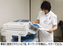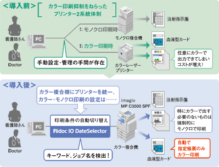 リコーが今回ご提案したのは、自動プリント設定ソリューション『Ridoc IO DataSelector』とデジタルフルカラー複合機『imagio MP C3500 SPF』/『imagio MP C2500 SPF』を組み合わせたソリューション。『Ridoc IO DataSelector』は、印刷データ内の文字列や印刷ジョブ名から任意のキーワードを検出し、帳票種別を識別して自動的に用紙サイズやカラー設定などの出力条件を切り替えて印刷できます。同病院では、カラー印刷が必要な帳票のジョブ名、キーワードを設定し、それ以外は強制的にモノクロ印刷されるように設定。たとえば『血液型カード』は自動的にカラーで、ホームページなど特にカラーで出す必要のないものはモノクロで出力されます。