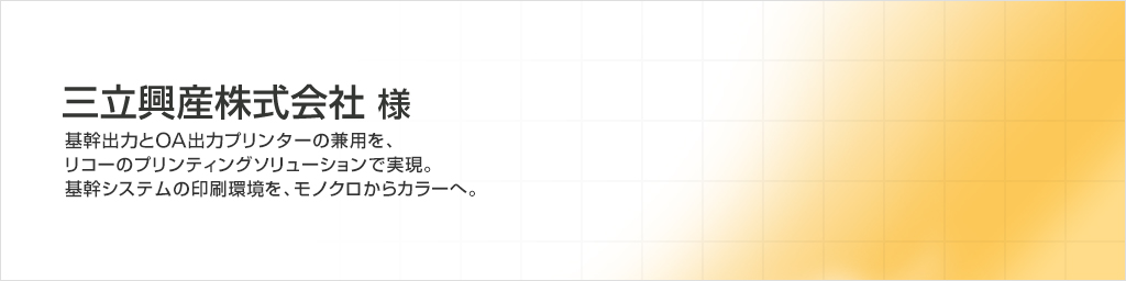 日本の「もの作り」を支える工作機械の専門商社、三立興産株式会社様。同社では、リコーのプリンティングソリューションにより、従来の基幹システム専用モノクロプリンターとOA用のプリンターを、カラーレーザープリンター「IPSiOシリーズ」で兼用することを実現。システム管理者の管理負荷を大幅に軽減し、印刷業務の品質向上に貢献しています。