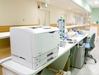 今回導入したレーザープリンターは、A4モノクロ機『SP 4010』(180台)、A3モノクロ機『SP 6220』(236台)、『SP 9100Pro』(4台)、そしてA3カラー機『SP C820』(5台)の4機種だ。 『SP 4010』と『SP 6220』は、外来診察室や入院病棟で活躍している。「立ち上がりがとても速く、印字スピードが速い点がありがたいですね。診療業務を妨げません。またトラブルが少ないことにも満足しています」(澤様)。『SP 9100Pro』は月間4万枚にのぼる大量のチェック用レセプト(診療報酬明細書)の印刷に使用されている。「従来は1日がかりだった印刷も、数時間でできるようになりました。トラブルがあると警報音が鳴るため、プリンターのそばに付きっきりでなくてよいのも助かります」(澤様)。『SP C820』は、入院患者の食事のトレイに載せる食札(献立や食材などの情報を記載した紙)を印刷するのに使われている。食物アレルギー情報をカラーで表記するなど、カラー印刷のメリットを患者の安全に役立てている。