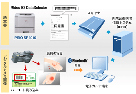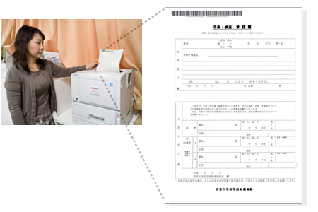 電子カルテシステムの導入などにより病院でのIT化はかなり進んでいますが、紙で運用したほうが効率のよい書類は多くあります。バーコード印刷に対応したリコーのレーザープリンターは、それら紙書類の管理に威力を発揮しています。また、バーコードを読み取れるリコーのデジタルカメラは、手術部位などを撮影した画像データの管理に活躍しています。
