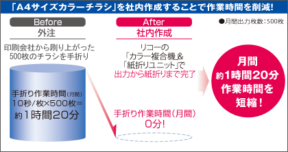 「営業の販促ツールにA4カラーチラシがあります。月に1度開催する住宅展示場見学会の告知用なのですが、枚数は500枚。出力は外注でしたが、近隣の家にポスティングするため3つ折りにしなければならず、この作業が非常に負担でした」