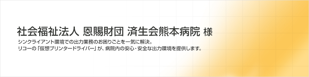 病院内のどこからでも医療情報を利用できるように、シンクライアント環境を導入した済生会熊本病院様。しかし、院内のすべてのプリンターアイコンがシンクライアント端末に表示されるため、目的のプリンターを選ぶのに時間がかかるだけでなく、別のプリンターに出力してしまう誤印刷の恐れがあった。さらに、シンクライアント上で動作するシステムには、特別な設定・カスタマイズが必要だった。こうした出力業務に関する院内のお困りごとを一気に解決したのが、リコーの「仮想プリンタードライバー」である。