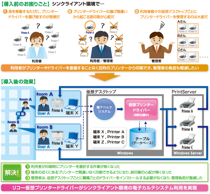 リコーでは、済生会熊本病院様の環境や要望を詳しくヒアリングした上で、独自の「仮想プリンタードライバー」を開発した。当初のシンクライアントシステム(SunRay)に加え、2011年10月の電子カルテシステムの本格稼働に合わせて導入したシンクライアントシステム(XenDesktop)に対応した製品である。