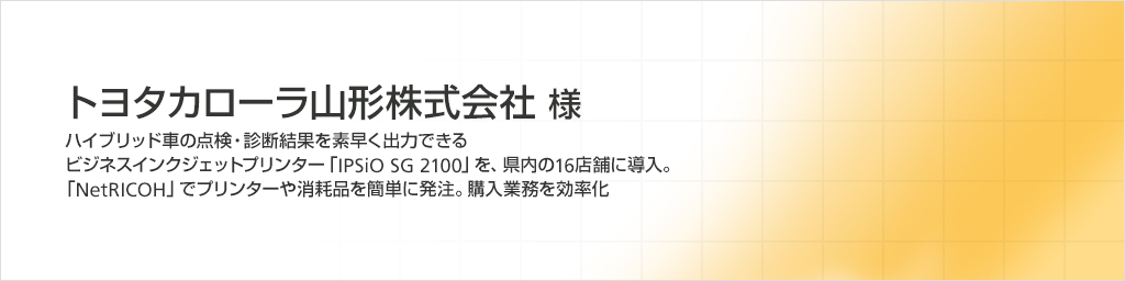 山形県は他県に比べて、世帯当たりの自動車保有台数が多い。全国有数の車社会における安全・快適なカーライフを支えているのが、トヨタカローラ山形様だ。同社は、新たにスタートしたハイブリッド車の点検・診断サービスの結果を高速出力するため、リコーのA4ジェルジェットプリンター(ビジネスインクジェットプリンター)「IPSiO SG 2100」を県内の16店舗すべてに導入した。プリンター本体やインクなどの消耗品の発注では、リコーのオンラインショップ「NetRICOH」を活用。スピーディで効率的な購入業務を可能にしている。