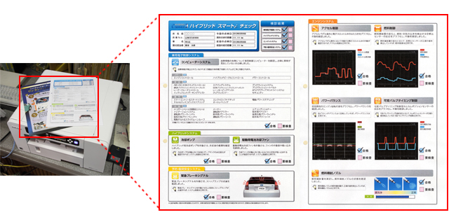 さらに、ハイブリッド車向けの「メーカー専用コンピューター診断」(ハイブリッドスマートiチェック)を新たにスタートさせた。ハイブリッド車に搭載されている各種コンピューターをチェックし、正常に制御しているかどうかを確認するものである。グラフなどを用いた分かりやすい形の帳票にして、その点検結果をお客様に提供している。
