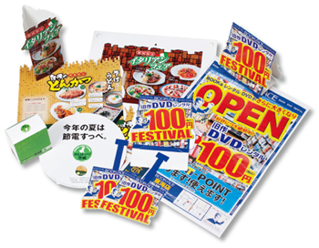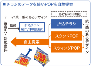 あけぼの印刷社にとって、サンプル提案効果が顕著な事例がある。折込チラシの制作印刷案件で、リクエストは統一感のあるチラシデザインだった。それまで取引のなかった相手に対し、統一感というリクエストを広げてとらえ、店頭でのスタンドPOP、スウィングPOPといった求められていないPOPを、チラシデザインと統一させ提案。これが得意先にとって、いいサプライズとなったのである。