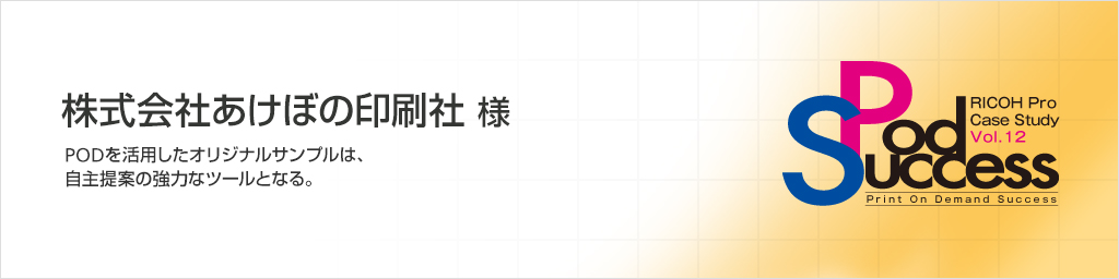 約2年前にターニングポイントを迎えたあけぼの印刷社。停滞する印刷業界の流れの中、POD(Print On Demand)活用を模索していた。すでにRICOH Proを2台導入済みで、1台は価格POP印刷にフル稼働。もう1台は、PODでの小ロット印刷やバリアブル印刷を特長として打ち出していた。「あの時点では業界内でのPODの盛り上がりを受け、これからはPODができなければ生き残れないとさえ、思っていました」と語る、山田氏。「しかし、思うようにPODの案件が増加していきません。セミナーに参加するなど試行錯誤を重ね、受注に結びつけるには提案型印刷会社へ変わらなければならないと決心。そして生み出されたのが、PODでサンプル制作し提案するというシンプルなアイデアでした」山田氏は小ロットやバリアブルにこだわらない、独自の活用法を見いだしていた。