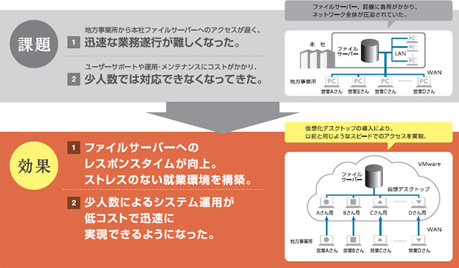 仮想化デスクトップの導入により、まず最大の課題となっていたサーバーへのアクセススピードについて地方展開する以前と同じようなスピードで使えるようになりました。