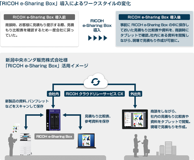 RICOH e-Sharing Boxを導入してから、ほぼ現場で業務を完結できるようになったと髙橋様は語る。「RICOH e-Sharing Boxを導入する以前は、商談時に見積もり提示する際、その場では大まかな数字だけをお伝えして、次回に改めて見積もりをお持ちしますと言って会社に戻っていたんです。今では、見積もり比較表や参考資料を事前にRICOH e-Sharing Boxの中に保存しておき、現場からタブレットでそれを確認できます。弊社のタブレットにはメーカー(本田技研工業株式会社)専用のアプリが入っているのですが、現場でそのアプリを使用して見積もりも作成できるんです。ですので、RICOH e-Sharing Boxに入れておいた資料を確認しながら、現場でお客様の要望に応じた見積もりを作成し、その場で提示することができる。作成した見積もりは、RICOH e-Sharing BoxにPDF保存し、会社に戻ってからプリントアウトして店長に決済をもらえばいいわけです。」(髙橋様)