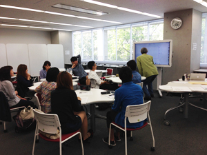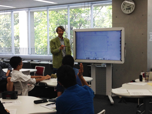 フィールドワーク(※)の際、学生はインタビュー調査をするにあたり、事前に質問項目を考え、大学のWebシステムに掲載します。そして授業でWeb上に掲載した質問項目をIWBに表示し、発表します。教授や学生は指摘やアドバイス等をリコー インタラクティブホワイトボード(以下リコー IWB)に書き込みながら討議しています。