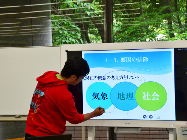インタラクティブホワイトボードは、ラーニング・コモンズでゼミを実施するための必須ツールです。学生がプレゼンする資料の上に書き込めるし、ホワイトボードのようにディスカッションの内容やまとめも書込みできます。
